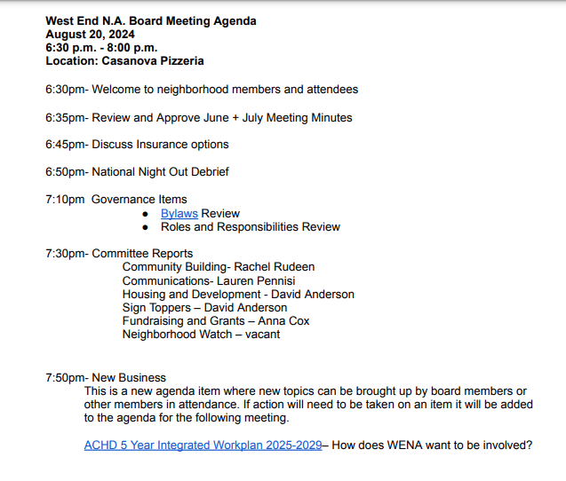 The WENA board is planning for next month’s annual meeting which is when residents can elect board members and the current board president provides residents with a recap of the board’s accomplishments.